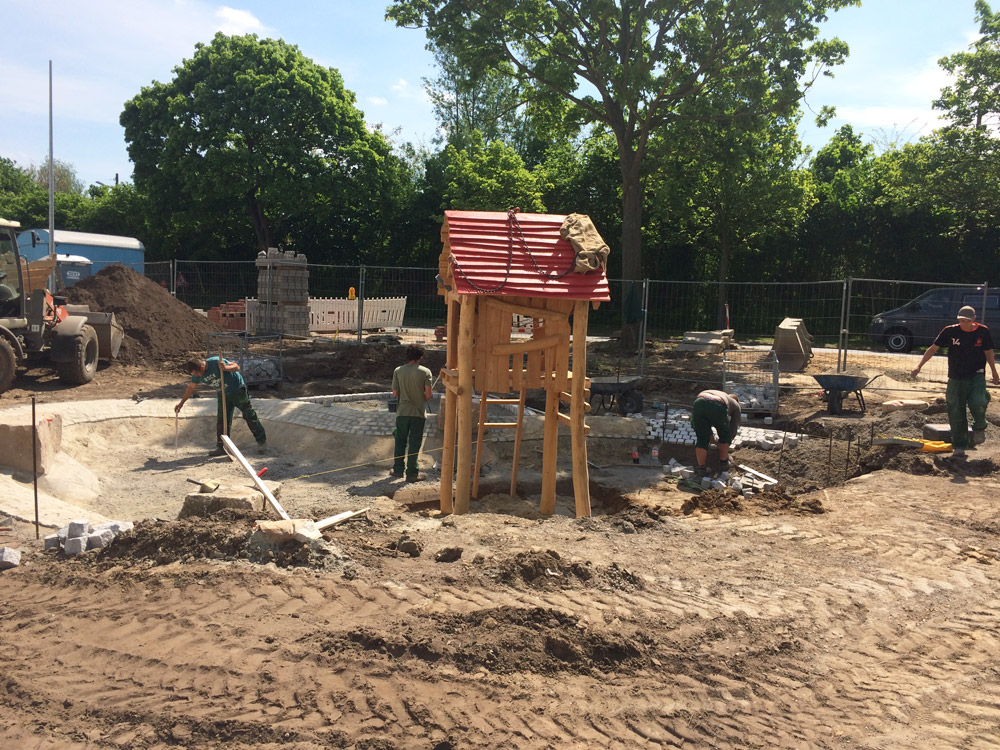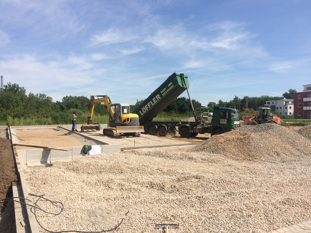 - Tiefbauarbeiten, herstellen von 500 m SW und RW Leitungen, Regenrückhaltung über 2 Rigolen, 15 St Mastleuchten mit Kabelgräben